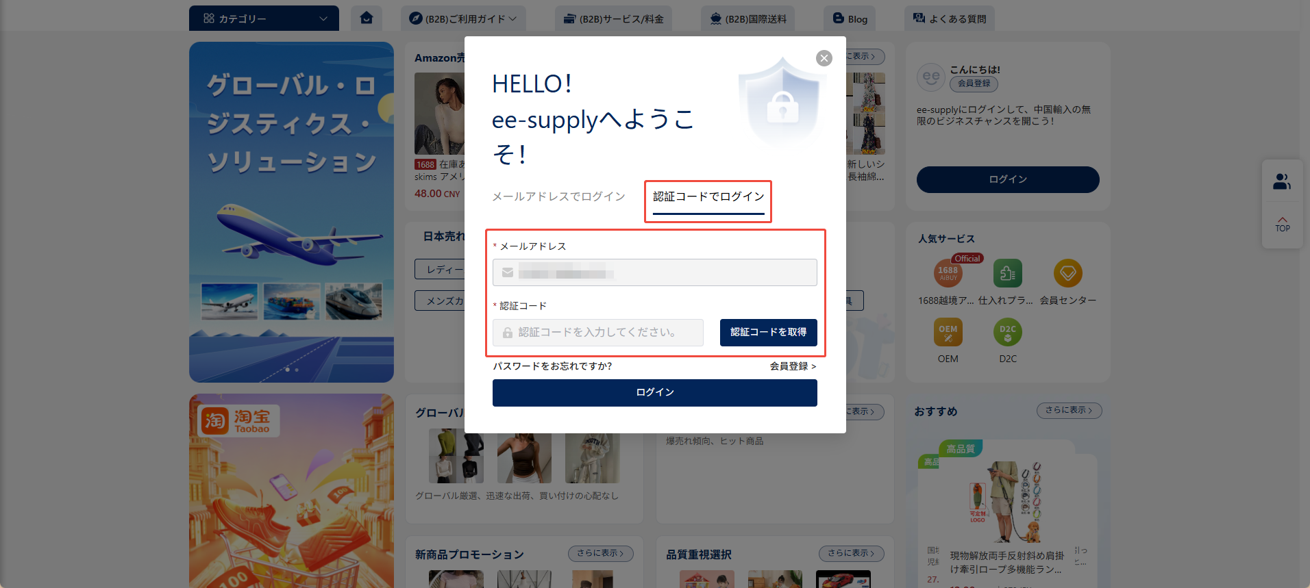 2、 ee-supplyサイトのトップページ左上にある「ログイン」ボタンをクリックすると、ログイン用のポップアップが表示されます。